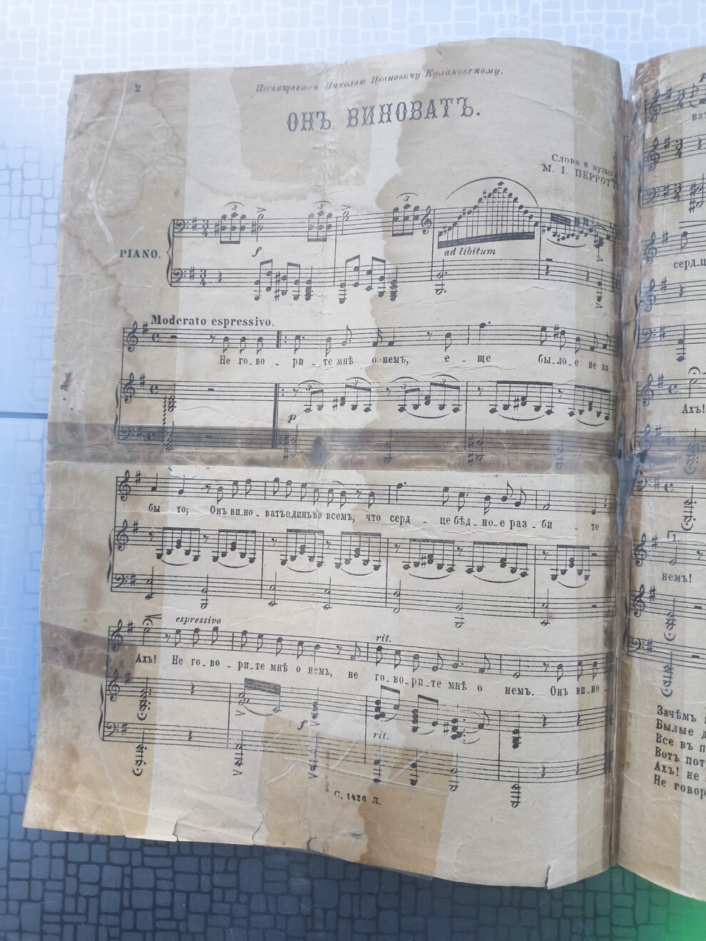 Он виноват. (Не говори мне о нем). Сл. и муз. М. И. Перротте. Две страницы нот с текстом. - Собственность издателя Музыкальный магазин "Северная Лира" А. Ф. Хавановой. Петроград, 1904 г. 23*31 см. Состояние см на фото.