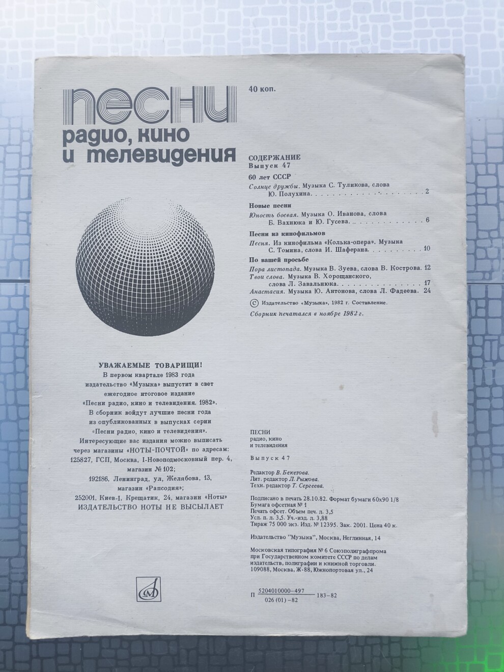Песни радио, кино и телевидения. Выпуск 47. - Музыка, 1982. 27 страниц. Обложка бумажная. 21,5*28,5 см. Состояние хорошее.