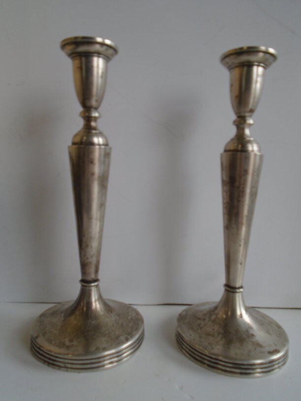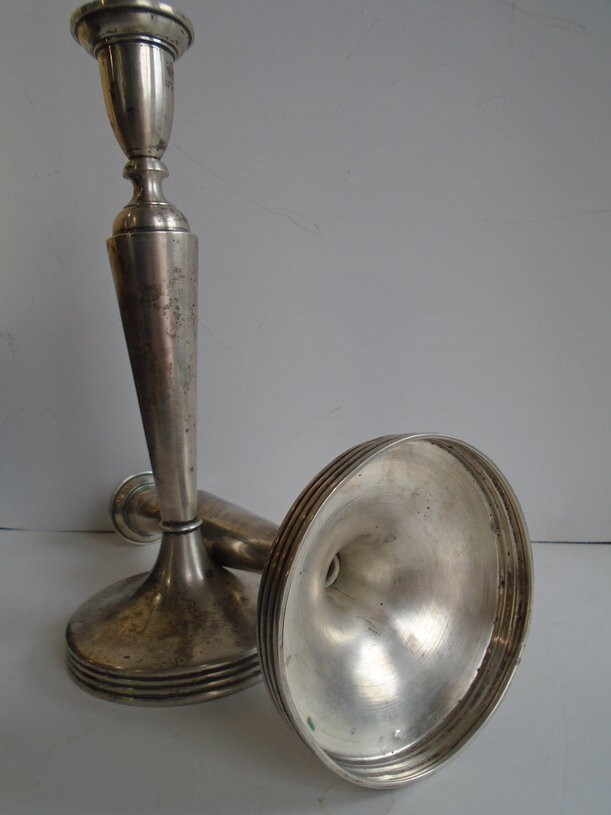 Строгая классическая пара серебряных подсвечников 19 века, может быть более раннего периода изготовления. Массивные, на первый взгляд, подсвечники, отлиты так искусно, что весят не более полукилограмма, а точнее 470 граммов- пара. Причем проба серебра очень велика, судя по заключению опытного ювелира. Два клейма- вдавлены в виде женской головы в кокошнике, и букв ФТ, что свидетельствует о Российском происхождении изделий, частная мастерская, серебряных дел мастер Фёдор Тимофеев, работал 1819-1840гг согласно каталогу старинных клейм