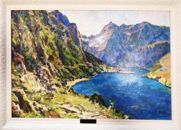 Реликтовое высокогорное озеро "Кезеной -ам" на границе Чечни и Дагестана служило одним из самых любимых сюжетов художника. Удивительно передана чистая глубина вод и полная опасности непредсказуемость гор Кавказа.